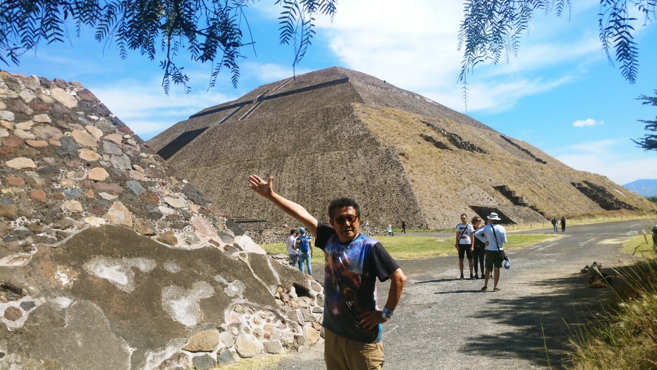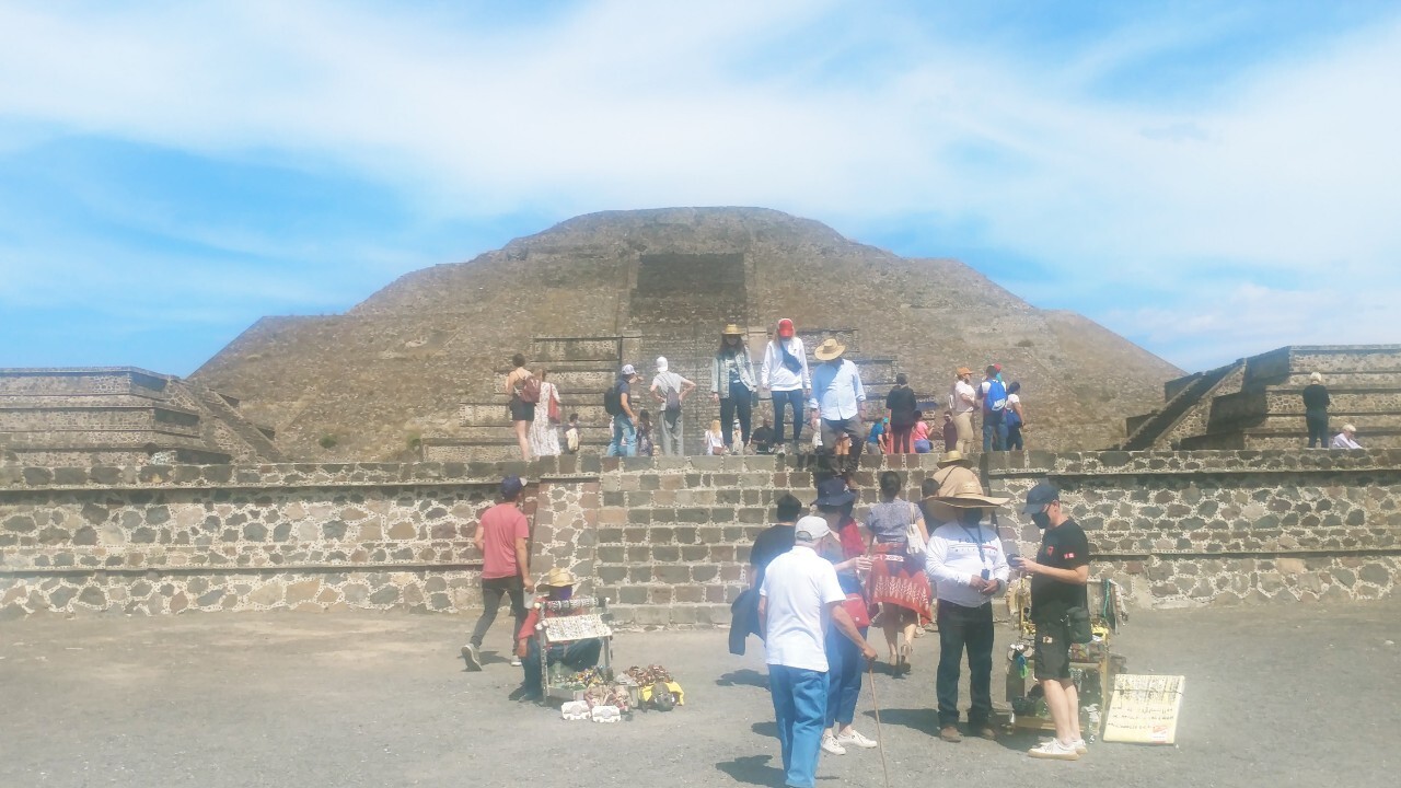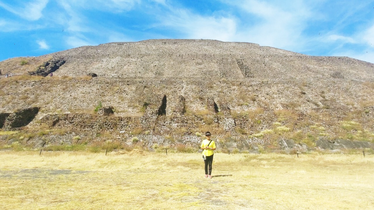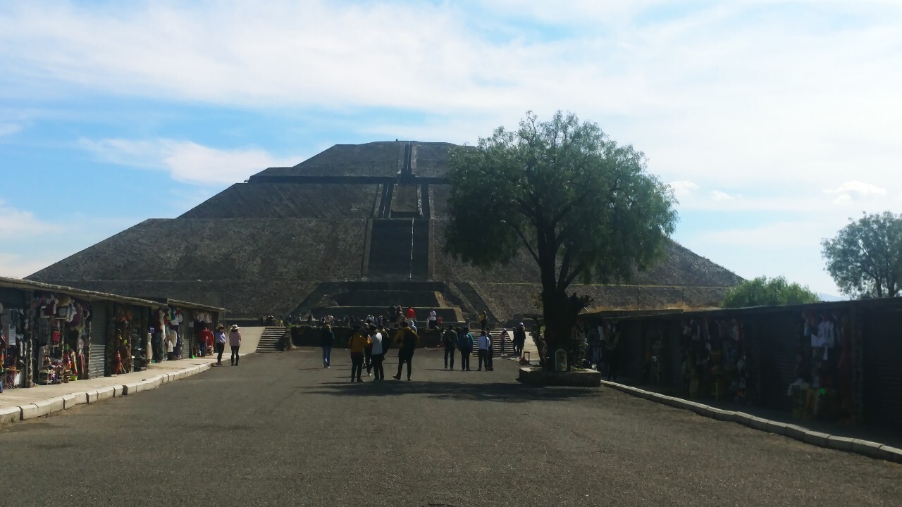 오른쪽에 보이는 태양의 피라미드를 뒤로 두고