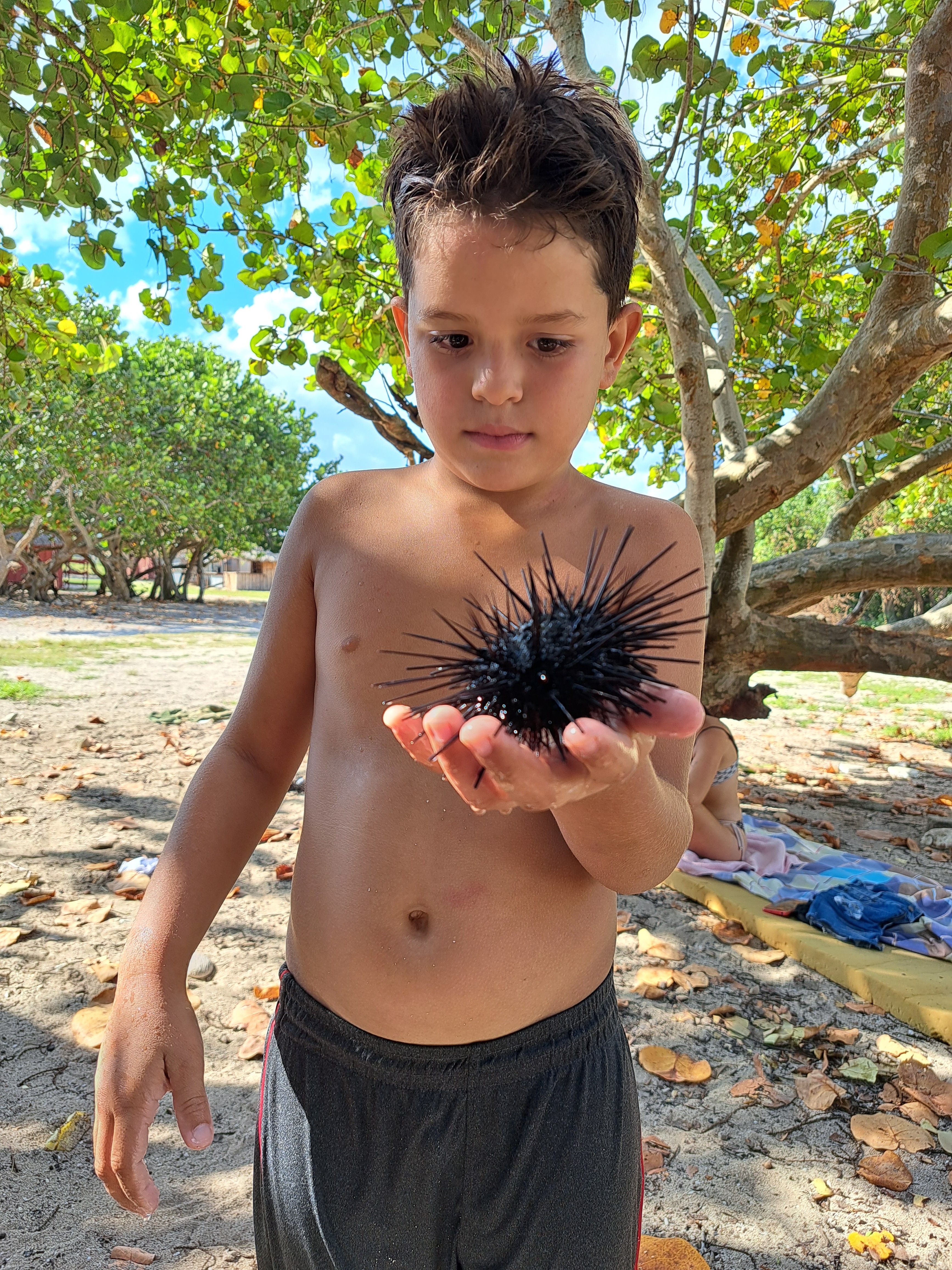 옆에서 바라보던 꼬마는 나에게 다가와서 자기가 잡은 성게를 자랑한다.