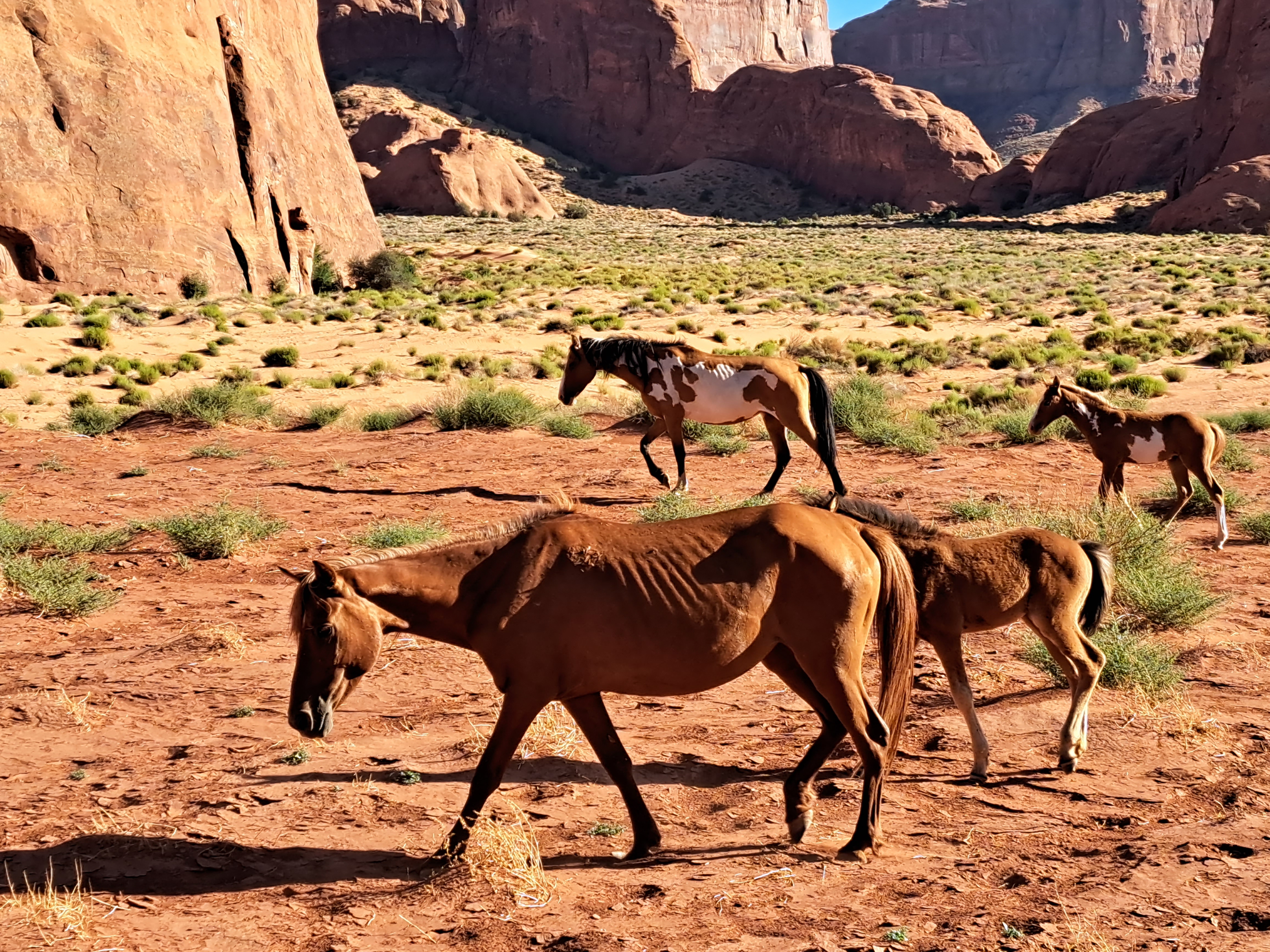 색상이 다른 어미와 새끼말이 지나가는 것을 볼 수 있습니다.