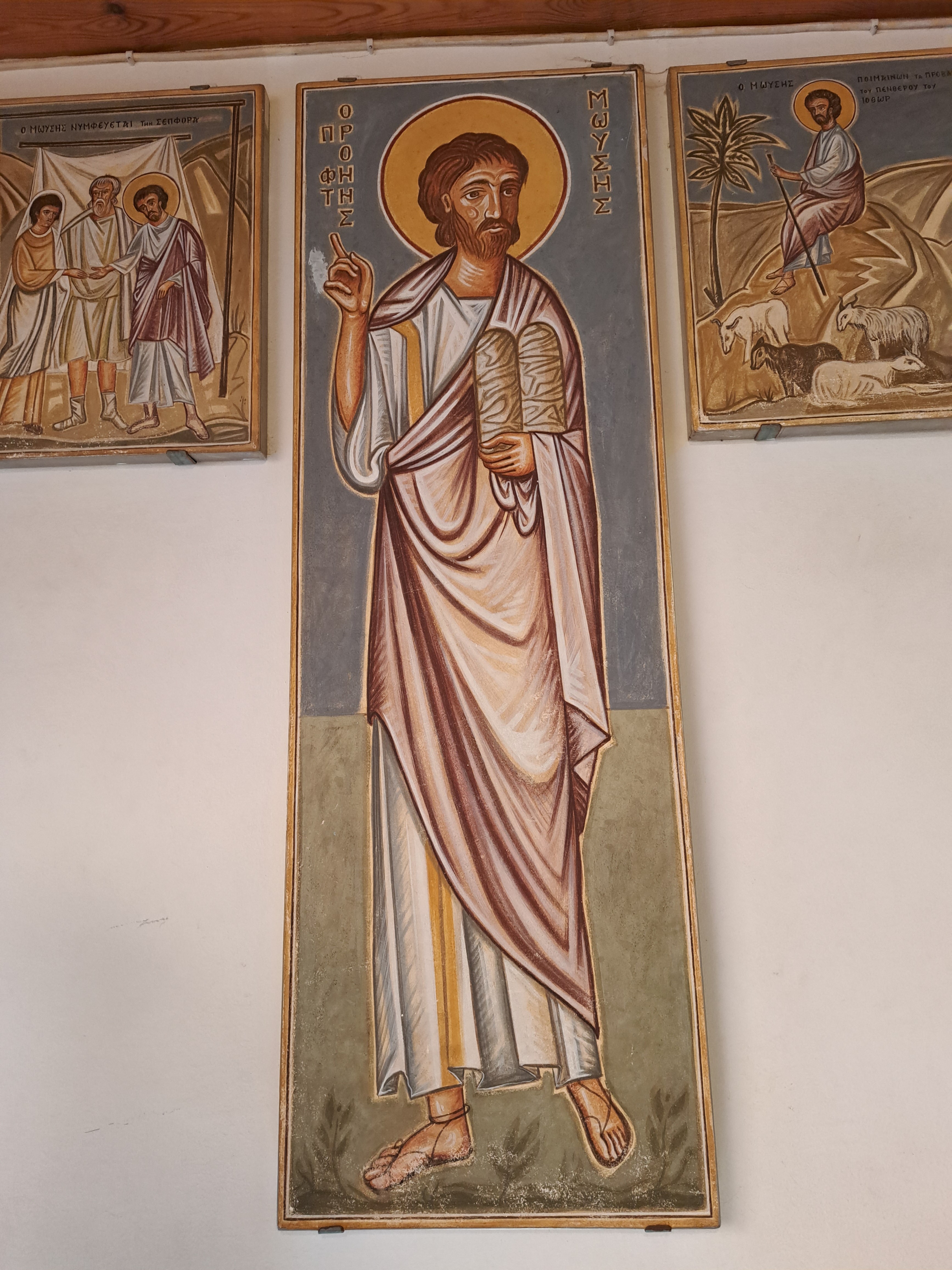 모세가 십계명을 받은 돌판 두 개를 들고 있는 모습도 있다.