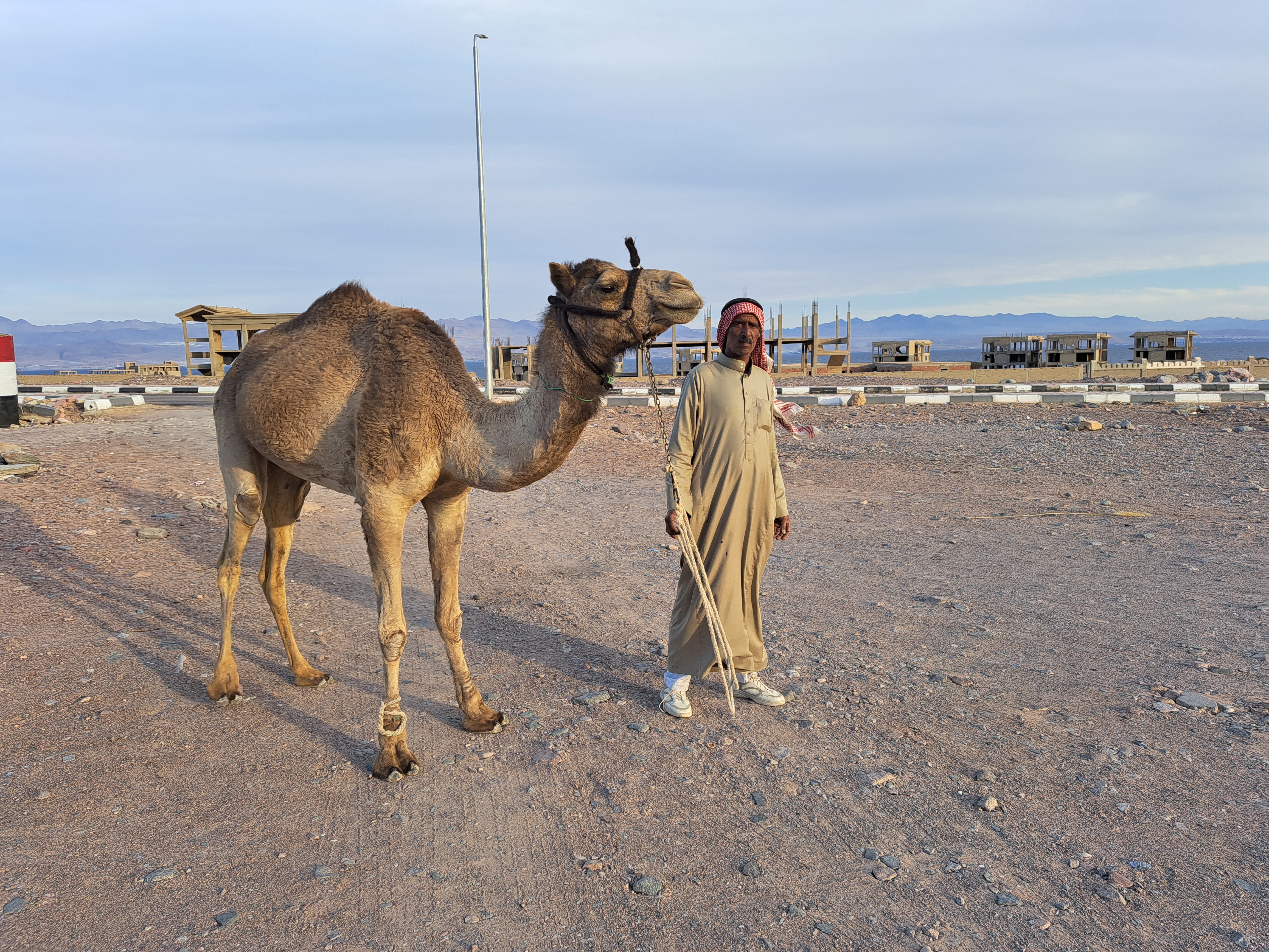 가족 중에 낙타를 데리고 가는 사람에게 낙타를 한번 만지기를 요구했다.