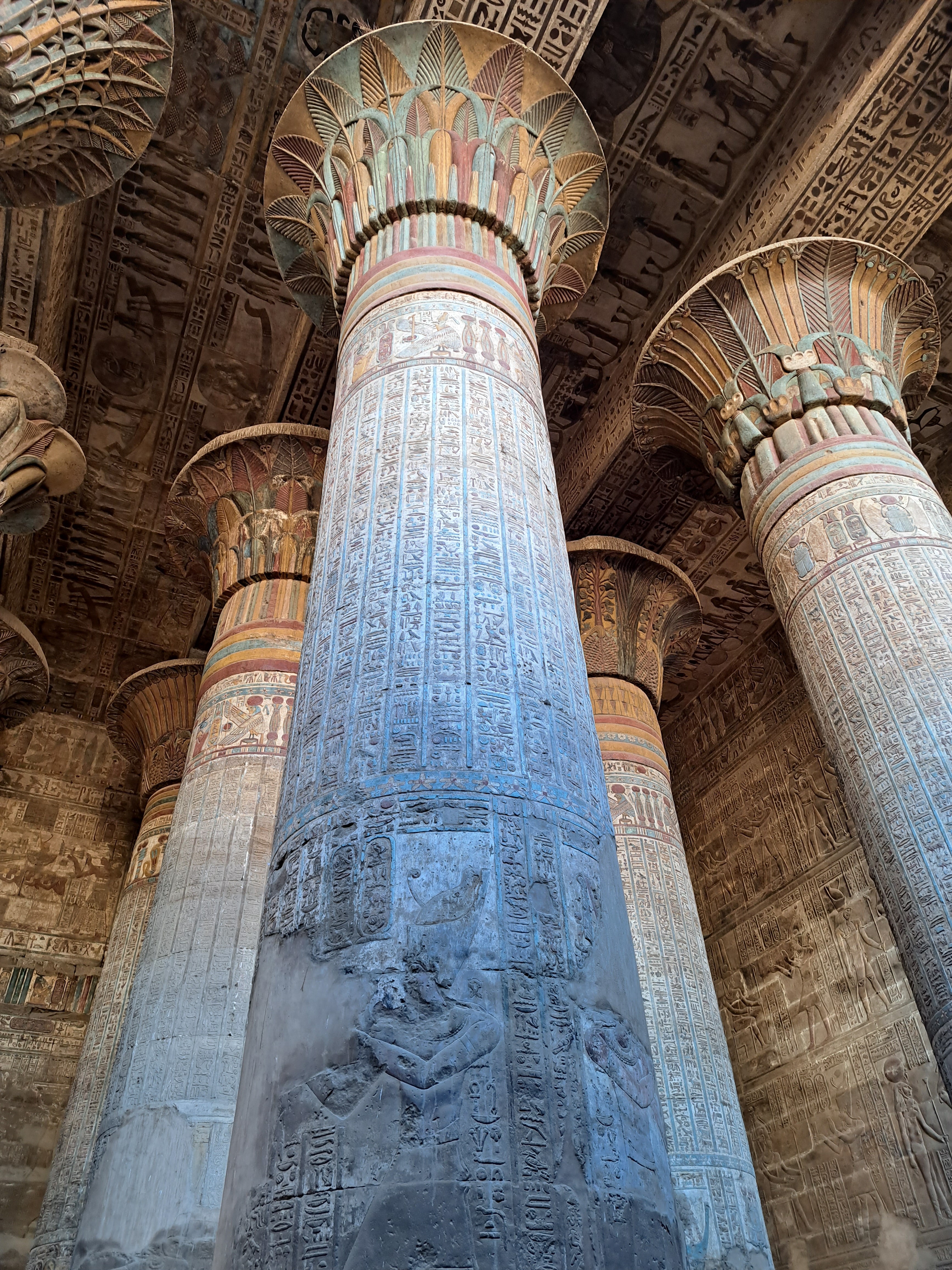 꽃봉오리 기둥이 볼만하다. 다열주홀 내부 방들의 벽화에는 파라오가 신들 앞에 나아가기 전