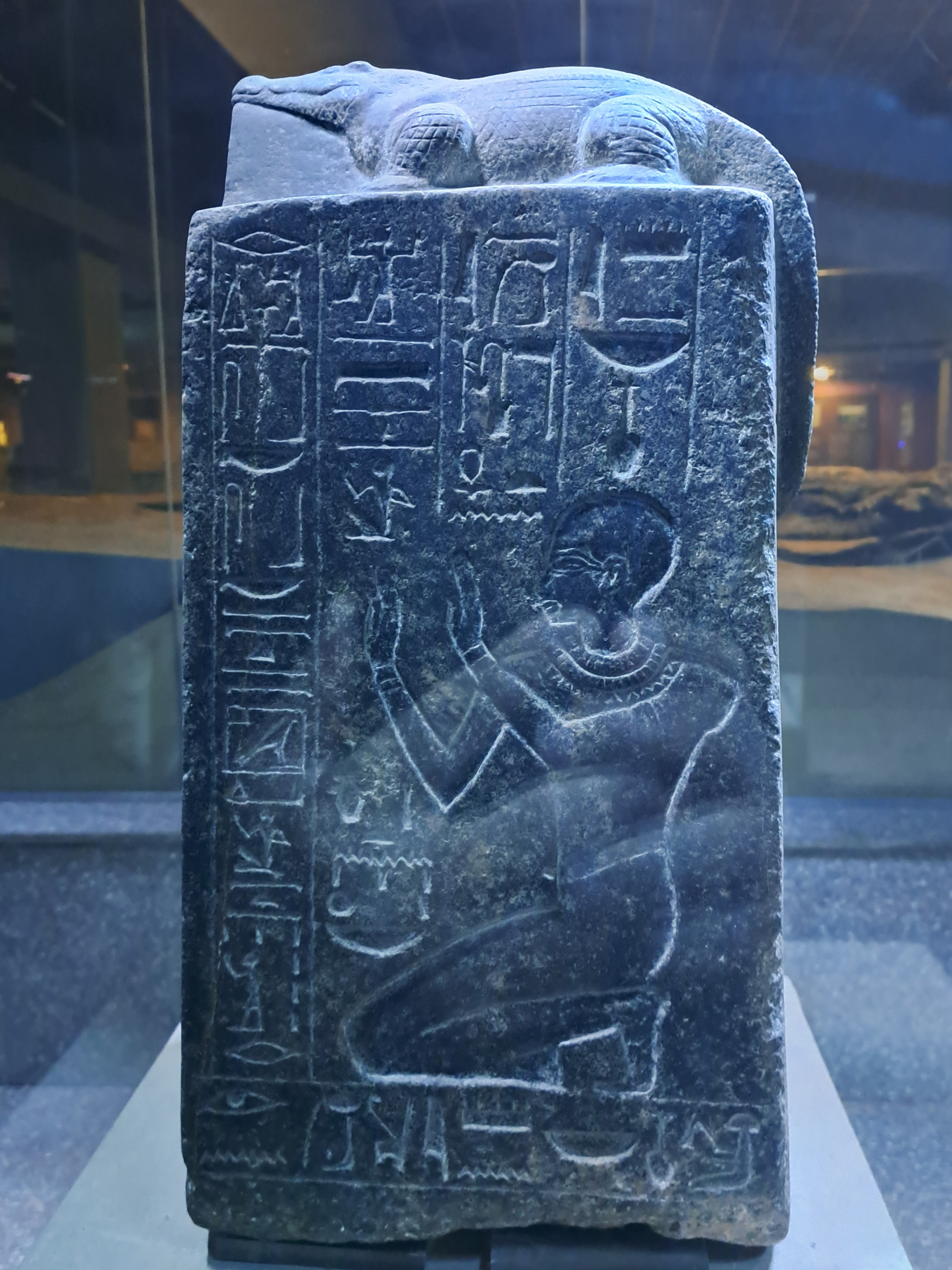 악어를 머리 위에 두고 무릎 꿇은 자세의 파라오